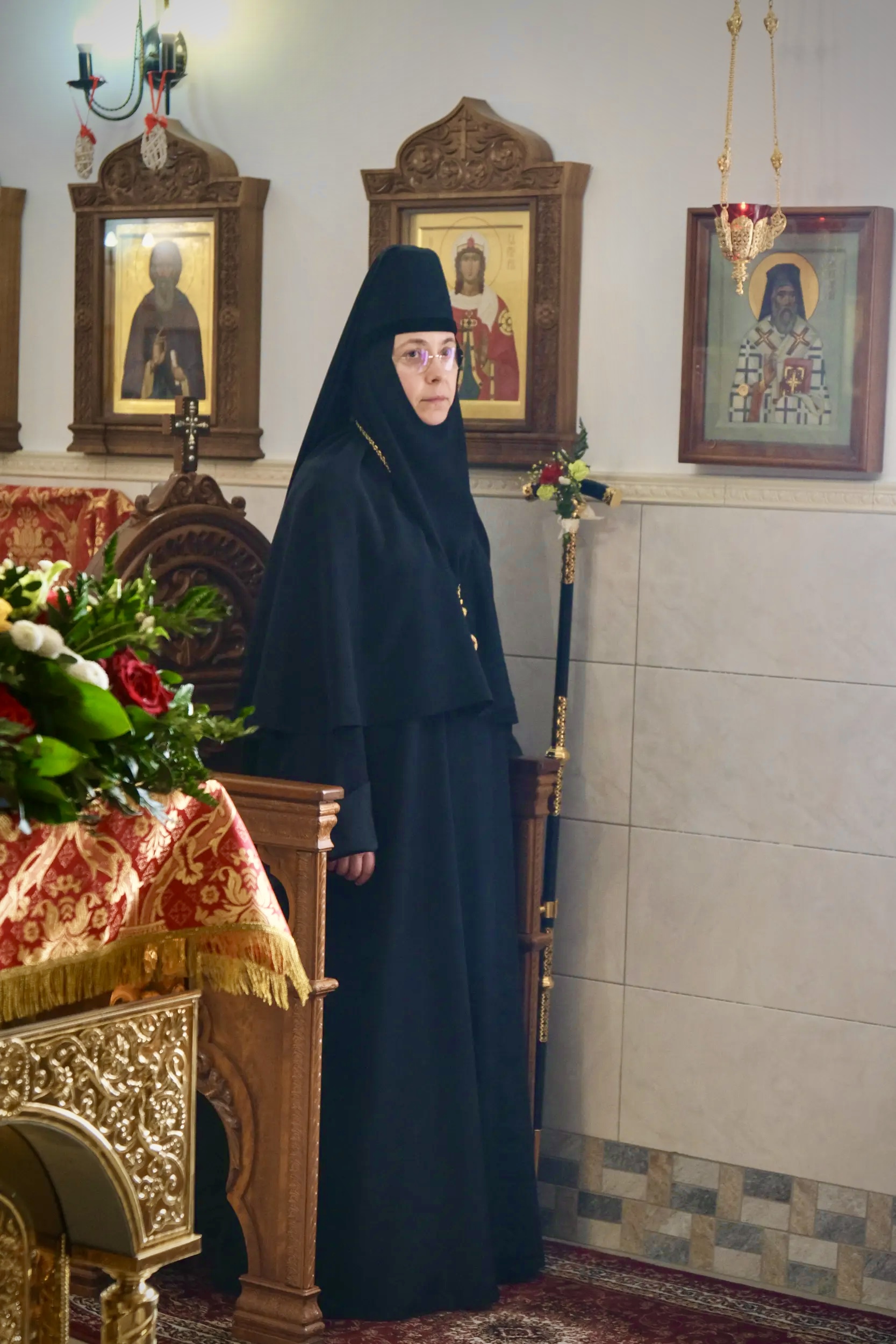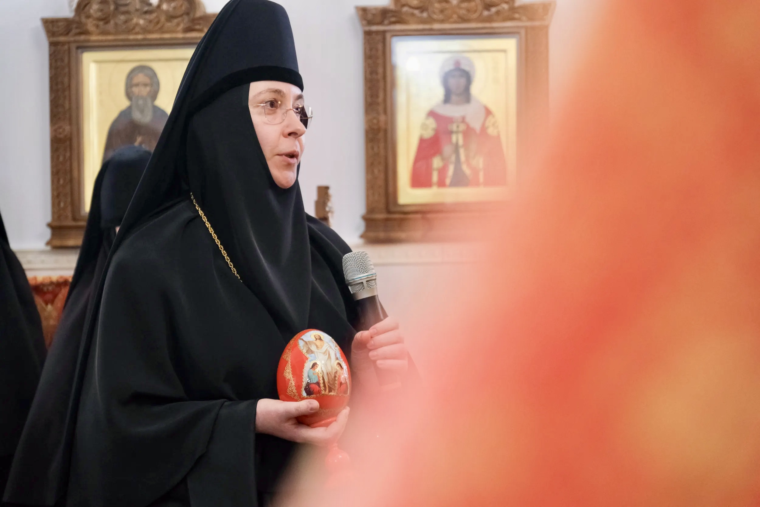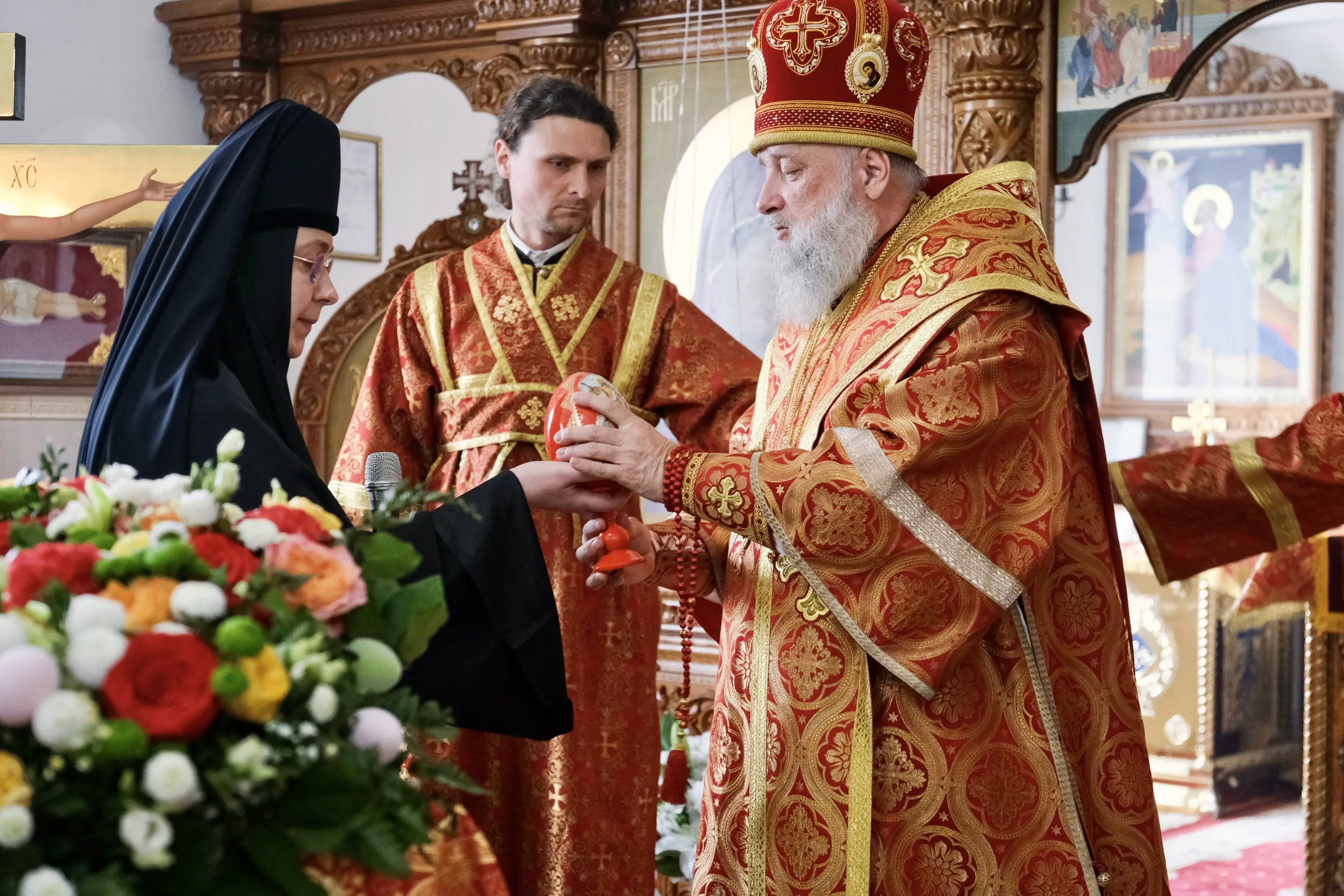 Настоятельница монастыря игумения Евфросиния в ответном слове поблагодарила Архипастыря за визит и преподнесла символ Воскресения Христова — красное пасхальное яйцо.