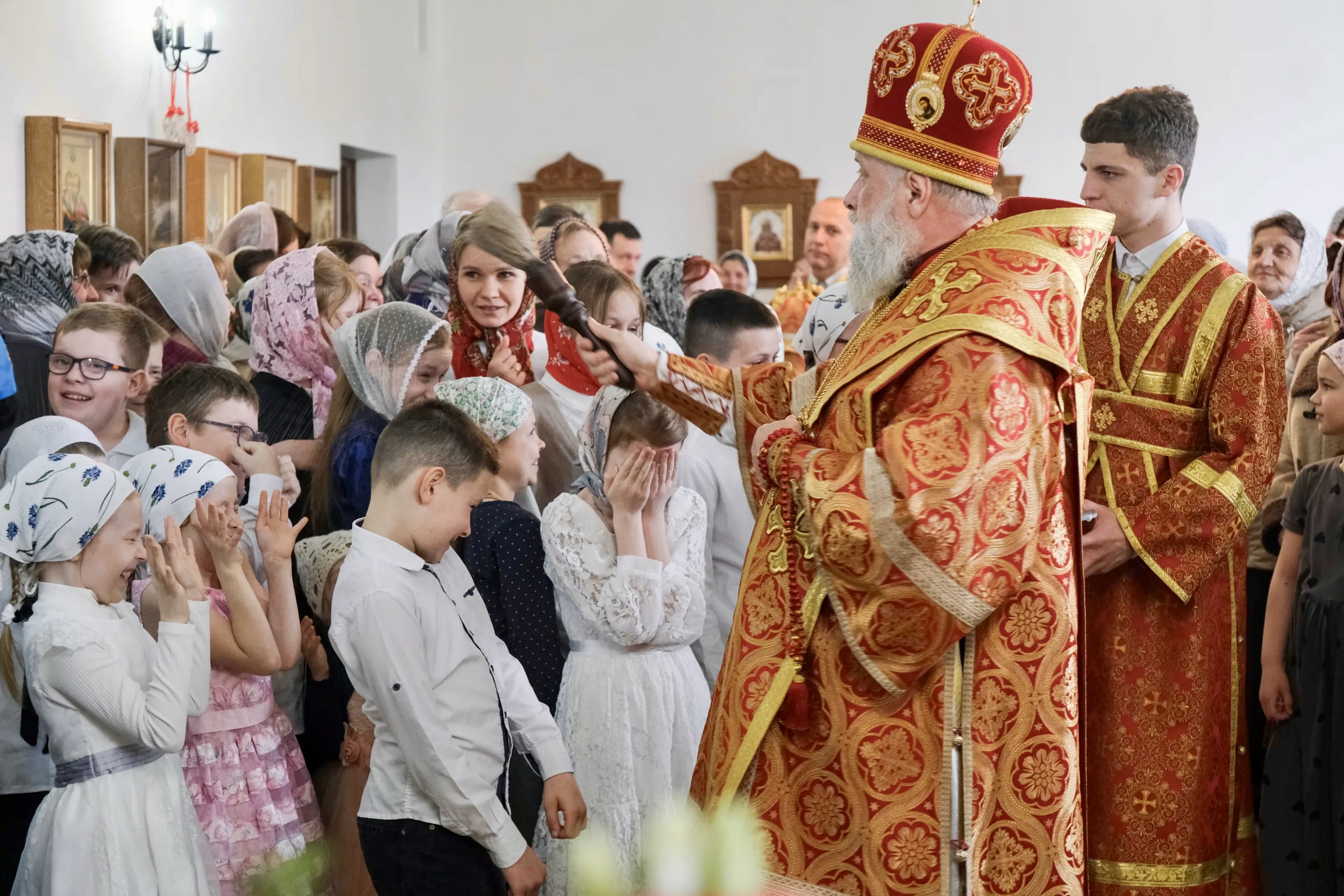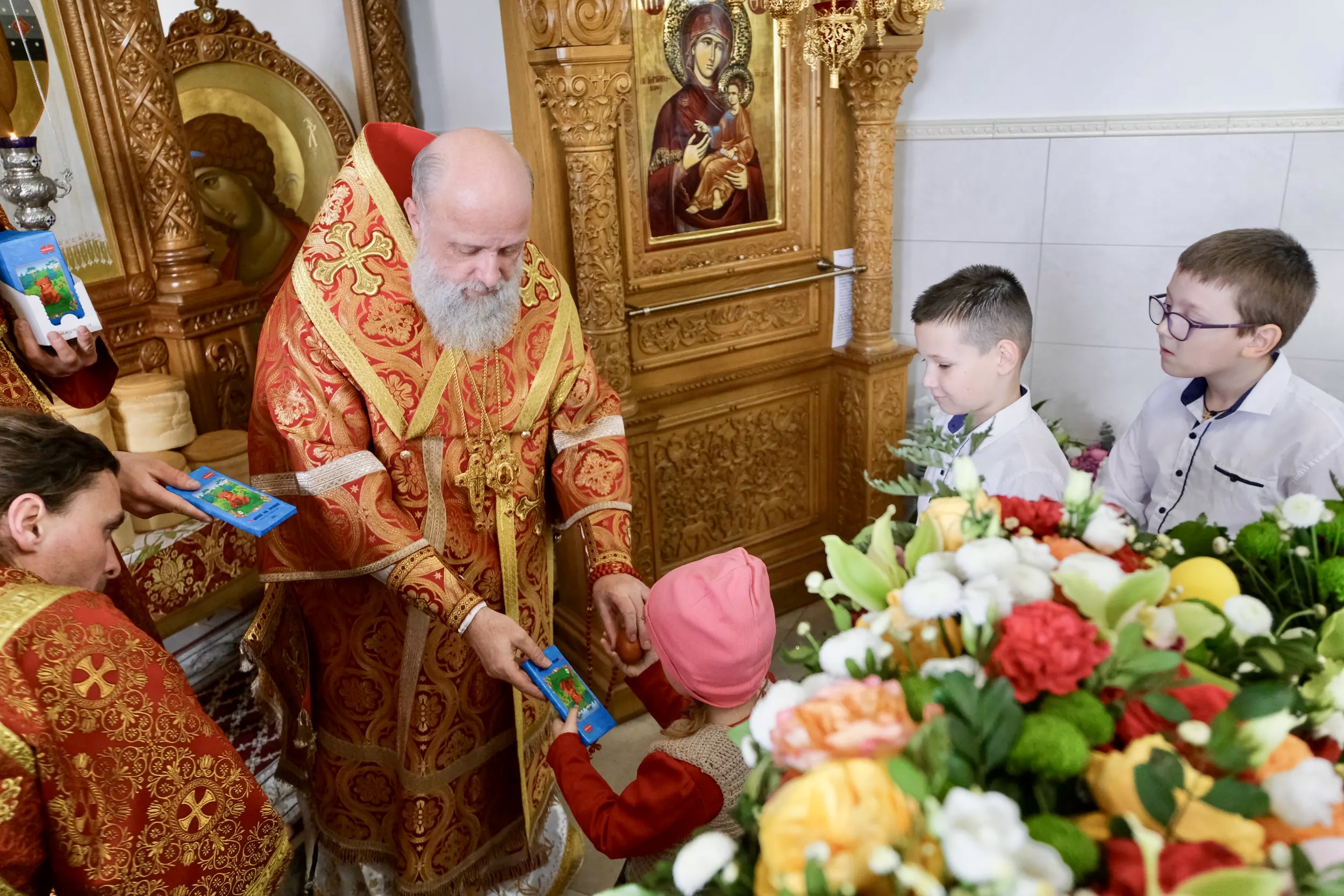 В завершение воспитанники воскресной школы, действующей при монастыре, поздравили архиепископа Иоанна с праздником Пасхи Христовой и получили из рук Владыки сладкие подарки.
